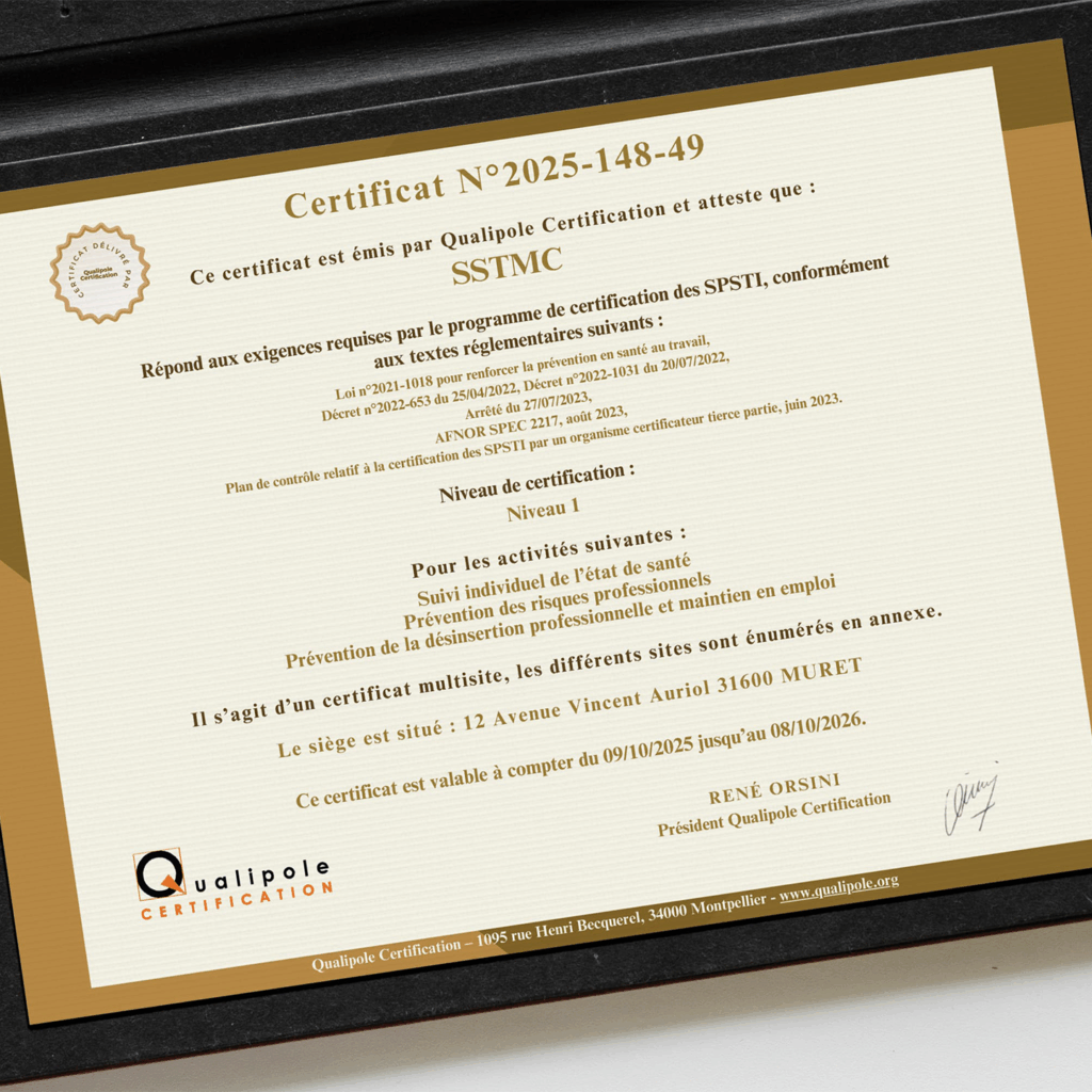 🎉 Le SSTMC est désormais certifié 𝗔𝗙𝗡𝗢𝗥 𝗦𝗣𝗘𝗖 𝟮𝟮𝟭𝟳 – 𝗡𝗶𝘃𝗲𝗮𝘂 𝟭 Cette certification valorise la qualité de notre engagement collectif pour : ✅ La prévention des risques professionnels ✅ La santé et la qualité de vie au travail ✅ L’amélioration continue de nos pratiques Elle atteste que nous mettons en place